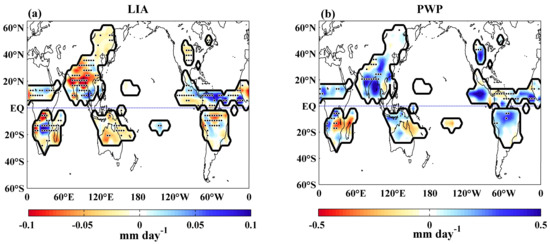 Global monsoon precipitation (GMP) domain and precipitation. Comparison of the GMP maps obtained by using (a) PWP (1900–2000) and (b) LIA (1250–1850) minus pre-industrial climatology (500–1850) in full forcing run. The monsoon domain is those regions where the annual range (local summer mean minus winter mean) of precipitation rate exceeds 2.0 mm/day and the local summer precipitation exceeds 55% of the annual total. Here, local summer is defined as May through September (MJJAS) for the NH and November through next March (NDJFM) for the SH. Stippling indicates statistical significance (10% significance level) based on t-test.
