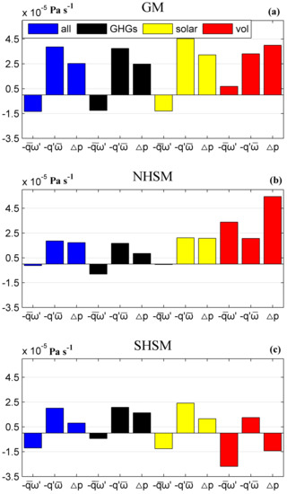 Under the GHG forcing (Figure 4a), the GMP intensification is induced by a moisture increase of 3.8 × 10–5 Pa s−1 °C−1, because the contribution of circulation change is negative (−1.3 × 10–5 Pa s−1 °C−1). This result is consistent with the finding in previous work by which under the GHG-induced global warming the GMP is enhanced by the wetter atmosphere, while the circulation is weakened [54]. Under solar-induced global warming, similar results are obtained; that is, the GMP increase is caused by a moisture anomaly rather than by a negative circulation anomaly. For one degree of global warming, the moisture-anomaly-induced GMP in the solar experiment is 4.5 × 10–5 Pa s−1 °C−1, which is stronger than that in the GHG experiment. In the volcano experiment (Figure 4a), the moisture anomaly also contributes greatly, by 83%, to the GMP increase. By contrast with the other two sensitivity experiments, the GMP change induced by the circulation anomaly is positive in the volcano experiment because the circulation is enhanced.
