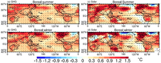 Figure 6 shows the difference of zonal-mean surface temperature and moisture between the PWP and LIA in the GHG and solar experiments. The low-latitude warming caused by strong solar forcing is stronger than that caused by strong GHG forcing no matter for boreal summer or winter (Figure 6a,b), resulting in stronger moisture increase in the monsoon regions under the solar radiation-induced global warming than under the GHG-induced global warming (Figure 5c,d). We conjectured that the weaker polar amplification induced by solar forcing is mainly due to the Earth’s curvature, which lets the high latitude receive smaller amount of solar radiation than the tropical region. However, to further investigate this issue, sensitivity experiments on the Earth receiving uniform solar forcing are needed. These could confirm whether the polar amplification effect would be the same as it is now if the poles were exposed to the same amount of solar radiation. The GHG forcing excites strong high-latitude warming in the NH for both summer and winter seasons, and this Arctic amplification is robust, consistent with many previous works [56,57]. Thus, the GHG forcing tends to warm high-latitude regions where the mean moisture is low, while the solar forcing causes more warming of low-latitude regions, resulting in a large moisture increase in the monsoon regions.