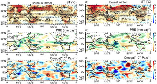 Figure 9 shows the horizontal distributions of surface temperature with wind, precipitation and circulation anomalies under the global warming induced by the reduction of volcanic eruptions. East–west asymmetric La Niña-like SST responses are excited by weak volcanic activity in both boreal summer and winter (Figure 9a,b). The clear warming spatial pattern in the NH compared with the SH (Figure 9a,b) and enhanced Asian and North American monsoon precipitation in response to La Niña SST (Figure 9c,d) are shown. During the boreal summer (Figure 9c), the Asian monsoon is enhanced, associated with strong westerly wind anomalies over the northern Indian Ocean. The strong anticyclone over south-eastern Asia and the western North Pacific reduces the precipitation over south-eastern Asia. Associated with this anticyclone, a strong Pacific–Japan (PJ) pattern [63,64] appears, and the south-easterly wind anomaly to the south of Japan transports moisture to enhance the precipitation over eastern and northern China. The North American monsoon is also enhanced, with strong wind convergence (Figure 9a,e). Associated with these enhanced North American and southern Asian monsoons, strong divergence occurs over the North African monsoon (Figure 9e), and precipitation is significantly decreased there (Figure 9c). During the boreal winter, the SH GMP change is location-dependent (Figure 9d). The Australian monsoon is strongly suppressed, except that its northern ocean part experiences enhanced precipitation. The precipitation over the inland part of South American and South African monsoons is slightly enhanced, surrounded by dry anomalies.