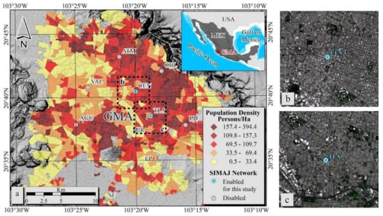 (a) Map of population density and monitoring sites located in Guadalajara metropolitan area (GMA). Blue circles show sampling sites location. (b) The Centro (CEN) and (c) Tlaquepaque (TLA) monitoring sites in the local context.