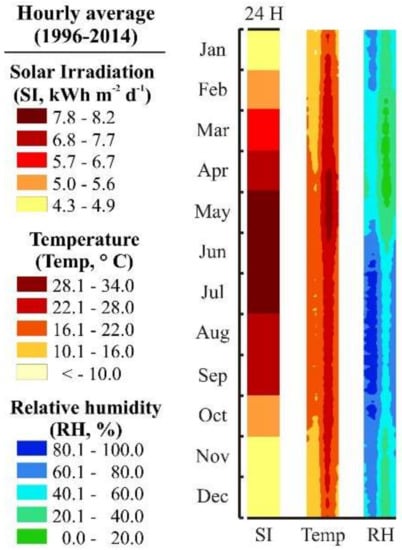 The climate of the GMA is wet/dry tropical climate, with annual averages for temperature and precipitation of 19 °C and 900 mm yr−1, respectively [,]. Figure 2 shows the annual average profiles for temperature (Temp.), relative humidity (RH) and solar irradiation (SI), calculated from SIMAJ continuous records during 1996–2014 in the GMA, with the highest temperatures and SI being observed between May and July.