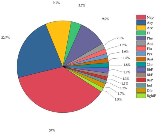 Overall, 16 US Environmental Protection Agency (EPA) priority PAHs were monitored: naphthalene (Nap); acenaphthylene (Ace); acenaphthene (Acy); fluorene (Fl); phenanthrene (Phe); anthracene (Ant); fluoranthene (Flu); pyrene (Pyr); benzo[a]anthracene (BaA); chrysene (Chr); benzo[b]fluoranthene (BbF); benzo[k]fluoranthene (BkF); benzo[a]pyrene (BaP); dibenz[a,h]anthracene (Dib); benzo[g,h,i]perylene (BghiP) and indeno[1,2,3–c,d]pyrene (Ind) []. Additionally, eight quinones were monitored: 1,4-naphthoquinone (1,4-NQ); 1,4-phenanthrenequinone (1,4-PQ); 9,10-anthraquinone (9,10-AQ); 1,4-anthraquinone (1,4-AQ); 9,10-phenanthrenequinone (9,10-PQ); 1,2-benzanthraquinone (1,2-BAQ); 1,4-chrysenequinone (1,4-CQ) and 5,12-naphthacenequinone (5,12-NAQ).