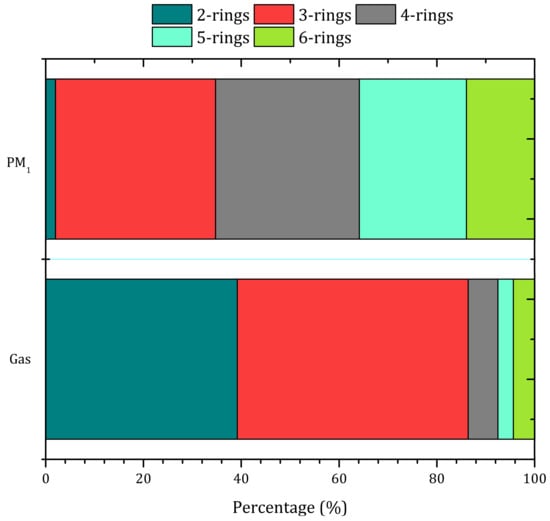 Distribution of PAHs in the gas phase and as PM1 according to the number of aromatic rings.