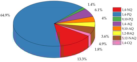 The ambient levels of quinones (Σ8Quinones; the sum of the concentrations for all quinones in the gas phase and as PM1) in the GMA ranged from 1.36 to 12.20 ng m−3, with an average of 7.46 ± 2.88 ng m−3. The quinones’ individual levels ranged from 0.0185 (9,10-PQ) to 10.5 (1,4-PQ) ng m−3. Table 7 shows the summary of descriptive statistics for the quinones’ concentrations in the gas and PM1 phases. Overall, the concentrations of quinones observed in the GMA were of similar magnitude, apart from the 1,4-PQ. Such concentrations are lower, except for 9,10-PQ, than those reported in Birmingham, UK, by Alam et al. [] with averages of 5.3 (9,10-PQ), 1.4 (1,4-NQ), 0.8 (AQ), 0.4 (1,2-BAQ) and 0.5 ng m−3 (5,12-NAQ). It is also important to note that comparisons from city to city must account for seasonal variability, meteorological factors, emission sources and other factors that influence the ambient concentrations of quinones. Figure 5 shows the individual relative contributions by quinone to the total ambient concentration. Overall, the 1,4-PQ was the most abundant compound and represented about 65.9% of the total mass, followed by the 1,4-NQ (13.1%), while the other quinones exhibited contributions lower than 10%.