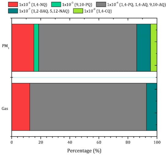 Simultaneous quantifications of quinones in the gas and particle phases remain scarce, and therefore there is little information to date regarding their phase-distribution []. The equilibrium between the gas and particle phases is directly related to the vapor pressure of the quinones and varies from season to season []. Here, the vapor pressure criterion (p°L, Pa at 298 K) was used for quinones, which were separated as follows: 1 × 10−1 (1,4-NQ); 1 × 10−3 (9,10-PQ); 1 × 10−4 (1,4-PQ, 1,4-AQ, 9,10-AQ); 1 × 10−7 (1,2-BAQ, 5,12-NAQ) and 1 × 10−8 (1,4-CQ). Overall, the most abundant compounds for both phases were in the group of 1 × 10−4 (Figure 6), where it is possible to observe quinones in both phases [,,].