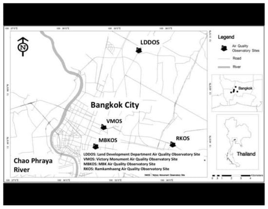 This study examined the impacts of fireworks displays on ambient air quality in Bangkok according to the mass concentrations of PM10 and their chemical characteristics, including selected metals. Data on ambient air quality were collected from four Pollution Control Department (PCD) Air Quality Observatory Sites, namely MBK (MBKOS), Ramkamhaeng (RKOS), Land Development Department (LDDOS) and Victory Monument Observatory Site (VMOS), which were carefully chosen for the assessment of selected metals in PM10. The positions of air quality monitoring sites in relation to a public firework display platform are illustrated in Figure 1. Bangkok has a tropical climate, with stifling hot temperatures (i.e., from March to June), high humidity (i.e., rainy season from July to October) and influences from the South Asian monsoon system. Precipitation differs greatly during the year, with between 180 mm to 220 mm of rain during the summer and the beginning of autumn, and only 10 mm of rain during the winter months.