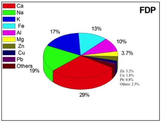 In this study, the atmospheric concentrations of crustal metals (i.e., the sum of Al, Ca, Fe, Mg, K, and Na) were 6582 ng m−3 for FDP and 7438 ng m−3 for NDP. Interestingly, the particulate contents of anthropogenic metals (i.e., the sum of Zn, As, Pb, V, Ti, Cr, Mn, Ni, Sr, Cu, Li, Cd, and Co.) were 510 ng m−3 for FDP and 468 ng m−3 for NDP. Since the anthropogenic metals were slightly higher in FDP, it seems rational to interpret particle injections triggered by firework displays as a main contributor to atmospheric concentrations of anthropogenic metals during the LKF period. These findings are also in good agreement with the finding that the TE concentration (see Equation (9)) detected in FDP (i.e., 581 ng m−3) was slightly higher than in NDP (i.e., 526 ng m−3).