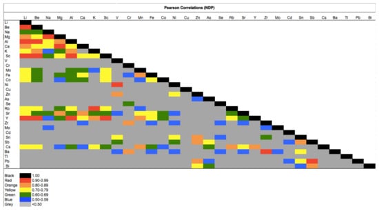 It is well known that selected metals can be categorised into two clusters: crustal metals (including Al, Ca, Fe, Mg, K, and Na), which could be principally attributed to high loading of crustal dust; and anthropogenic metals (such as Zn, As, Pb, V, Ti, Cr, Mn, Ni, Sr, Cu, Li, Cd, and Co.), which originate from human activities (e.g., traffic exhaust, industrial emissions, burning of fossil fuels) []. It is also crucial to note that Na, Cl, Br can be categorized as sea-salt particles [,,] while Ca, Mg, K can be considered as particulate matters which originated from biomass burnings [,,].