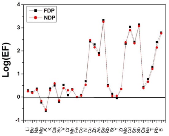 Logarithms of enrichment factors for 31 selected metals collected during FDP and NDP.