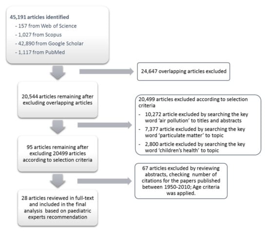 Our review was based on a collection of scientific papers and topical reviews, selected in cooperation with two experienced paediatricians (>25 years of praxis) from two emergency hospitals located in different cities. The literature was obtained by using a step-by-step search string in four of the most accessed databases (Scopus, Google Scholar, Web of Science, and PubMed), using the first keyword with subsequent ones in the following order: Air pollution—Particulate matter—Children’s health—Respiratory. The search period was from 1950 to 2016.