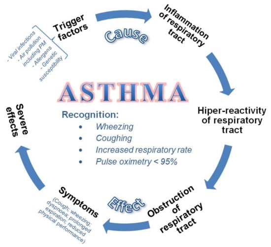 Figure 2 illustrates the cause—effect relation in asthma, starting from various triggers including air pollution, to aggravating effects such as inflammation, hyperactivity and obstruction of the respiratory tract. If specific medication does not succeed in reducing the severity of symptoms, emergency room visits and/or hospital admission are required. Modifications of symptomatology may result from removal of pollutants or allergens/irritants around children, seasonal changes with variable exposure to pollen or dust, increase in viral infections during the cold months, and lung development together with child evolution influenced by the genetic susceptibility [,]. A comprehensive overview regarding the impact of early-life exposure to airborne environmental insults on the function of the airway epithelium in asthma can be found in Spann et al. (2016) [].