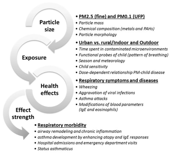 The following section presents a synthesis of our literature review, pointing out in brief the key research elements about the relationship of PM to respiratory health effects in children. Due to the numerous findings in various fields of this topic, the synthesis is presented following the DPSEEA (Driving forces, Pressures, State, Exposures, Health effects and Actions) framework [,], focussing mainly on novel approaches and future trends regarding the PM effects on children’s respiratory health.