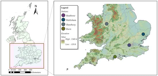 Heavy precipitation, which could lead to recurring flood events and cause serious damage to infrastructure, is of increasing concern in Europe [21]. Many studies have indicated an increase in the frequency and intensity of heavy rainfall in the United Kingdom (UK) [22,23]. The Met Office operates more than 200 automatic weather stations across the UK. In this study, we selected four representative weather stations in the south of England (Heathrow, Wattisham, Shawbury, and Hurn) with long period (more than 57 years) and high temporal resolution observation data to identify uncertainties stemming from RCM downscaling ratios in the IDF curves. The locations of the four selected stations are displayed in Figure 1, and Table 1 shows the mean and standard deviation of the annual maximum rainfall (mm) for five periods from 1960 to 2016.
