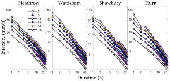 The observed temperature and precipitation data were obtained from the Met Office Integrated Data Archive System Land and Marine Surface Station Data [24,25]. To obtain historical IDF curves and correct the bias of daily precipitation data simulated by the RCM, we used long-term (1960–2016) hourly rainfall data from the UK. Figure 2 shows the historical IDF curves for return periods of 2, 5, 10, 25, 50, and 100 years [8,13] obtained from the annual maximum rainfall series (durations 1–24 h). There curves were generated with data from the four study stations fitted to the generalized extreme value (GEV) distribution suitable for modeling extreme rainfall [26] with the parameter locations (μ), scales (σ), and shapes (ξ) using the maximum likelihood estimation (MLE) method.