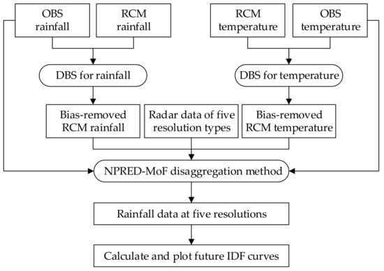 To further explore the scale-driven uncertainty of the IDF curves, future IDF curves from the four stations were constructed for five time scales and 11 RCM ensemble members using a distribution-based scaling (DBS) [30,31] approach to remove the bias of the RCM. A statistical downscaling method that combined nonparametric prediction models and the method of fragments framework (NPRED-MoF) [15] was used to disaggregate future daily rainfall to hourly or sub-hourly scales. The construction procedure of the IDF curves for each RCM ensemble member and each station is presented in Figure 3. First, we applied the bias correction for RCM precipitation and temperature based on the DBS approach. The input dataset was the historical observed and RCM rainfall and temperature, and the output dataset was bias-removed RCM rainfall and temperature. Second, we disaggregated the future rainfall from a daily resolution to five temporal resolution durations based on the NPRED-MoF method. The input dataset was the bias-removed RCM rainfall and temperature, radar data, and historical observed rainfall and temperature, and the output dataset was the future rainfall data of the five hourly and sub-hourly resolutions. Finally, the annual maximum rainfall for 24 durations of 1–24 h were extracted and fit to the GEV distribution to identify the maxima using the MLE method. The rainfall intensities for different return periods (2, 5, 10, 25, 50, and 100 years) were then calculated, and the five types of IDF curves based on the rainfall intensity from six return periods and 24 durations could be plotted.
