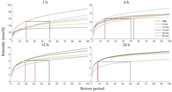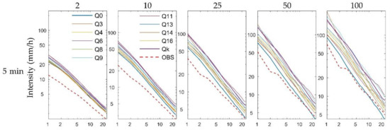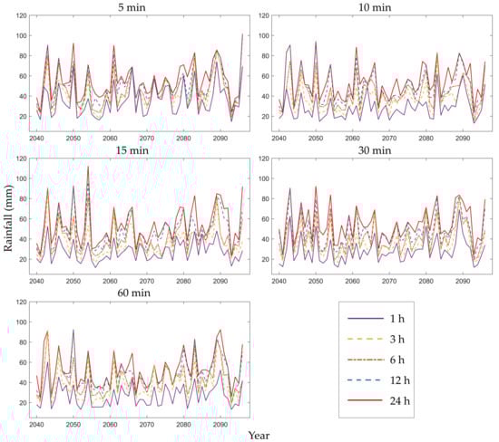 Figure 4 displays the annual maximum rainfall series for the period 2040–2096 at the Heathrow station for 1, 3, 6, 12, and 24 h; the results were based on temporal resolutions of 5, 10, 15, 30, and 60 min for the first RCM ensemble member (Q0). The overall distributions were similar to those of the five time scales, but the local differences were significant, implying that the IDF curves may have been dissimilar.