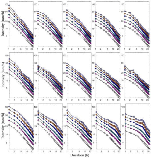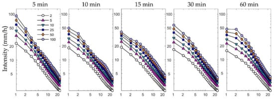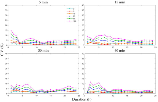 The C.V. distributions of the rainfall intensity, with the downscaling procedure implemented five times, for six return periods and 24 durations are presented in Figure 11. Each subplot is based on one of the fixed downscaling scales. The C.V. values for shorter durations were larger than those for the longer durations and were below 10% for most values; however, the downward trends were not pronounced. Regardless, the uncertainty increased as the return period lengthened. Comparing the first plot in Figure 8 with each plot in Figure 11, the C.V. in the latter was much smaller than that of the former for shorter durations, suggesting that uncertainties due to downscaling ratios are much greater than those due to the downscaling method for these durations. However, the values in Figure 11 were not invariably smaller than those in the first subplot in Figure 8 as the duration lengthened, implying that it might not be possible to clearly identify the source of this uncertainty for longer durations. Nevertheless, most of these C.V. values were below 5%, which is sufficiently low to neglect the corresponding uncertainty. Therefore, the durations for which the uncertainty cannot be neglected are mainly those affected by the downscaling ratio.