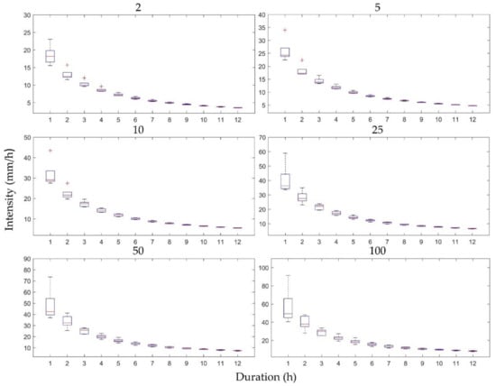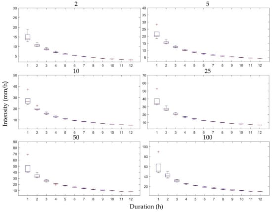 The uncertainties of the future IDF curves resulting from downscaling RCM ratios were characterized as box plots of the IDF curves based on the five temporal resolutions and the first RCM ensemble member for the six return periods (2, 5, 10, 25, 50, and 100 years) for Heathrow (Figure 6) and Wattisham (Figure 7) stations. These plots show the differences only for 12 durations (1–12 h), because the differences between the other durations were too small to observe in box plots. Notably, the differences in the IDF curves in Figure 6 and Figure 7 were considerably higher for shorter durations and seemed to follow a downward trend as the durations lengthened. Shawbury and Hurn stations showed similar trends.
