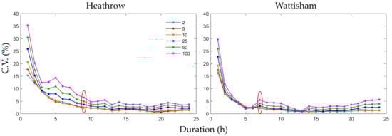 The C.V. distributions for the same durations, return periods, and stations were plotted (Figure 8) to determine the relationship between the C.V. and the durations of different return periods. The C.V. decreased exponentially with increasing durations for each return period and increased as with each increasing return period for each duration. Both stations exhibited turning points, after which the C.V. did not decrease with increasing duration (at 9 h for Heathrow station and at 7 h for Wattisham station), and the C.V. was below 5% in most cases after those points. These results imply that the influence of the downscaling ratios on the uncertainties of the curves are significant below a certain duration (generally between 5 and 10 h) at each station. In other words, the uncertainty associated with scale can be ignored when the duration is higher than the turning point. Moreover, the increasing trend as a return period lengthens is more conspicuous for shorter durations (1 or 2 h).