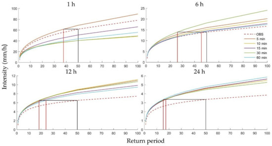 To further explain the relationships between the uncertainties and the historical climate, rainfall duration, and return period, Figure 9 and Figure 10 show the rainfall intensity of the historical and future climate predicted with five downscaling scales for four durations (1, 6, 12, and 24 h) for Heathrow and Wattisham stations. The intensities of future storms intensity appeared to be greater than historical storms in most cases and were more pronounced for longer durations. Surprisingly, the IDF curves resulting from the 1 h station data showed that the intensity of the historical storms was even greater than several future storms. Comparing the four plots, the uncertainty appeared to be more significant for shorter durations and longer return periods, as noted above, showing a clear descending trend. For instance, at Heathrow, the future frequencies of rainfall at intensity occurred once every 50 years in the historical climate but exhibited an impossibly large range for the 1 h duration (see the vertical red and black lines in the first subplot of Figure 9). However, this range decreased to a more reasonable 37 years for the 6 h run, 12 years for the 12 h run, and 1 year for the 24 h run (see the vertical red and black lines of the remaining subplots in Figure 9). Wattisham station showed similar trends (Figure 10). These results imply that the future IDF curves obtained from one specific downscaling time scale are highly unreliable for short durations and long return periods.