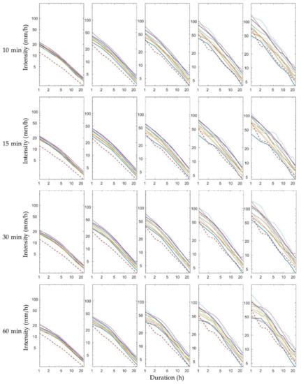 We obtained the IDF curves for all 11 RCM ensemble members to rule out differences in the data stemming from the use of only one particular ensemble member. Figure 12 shows the IDF curves for the historical (red dotted line) and future (11 solid lines) climates for five return periods for Heathrow station. The IDF curves show an obvious increase in both intensity and frequency for future storms compared to the historical data from the subplots in Figure 12. The future IDF curves were more compact for shorter return periods for each time scale and appeared to have a parallel linear relationship that was more pronounced for the shorter return periods for each scale. The other stations also had similar patterns.