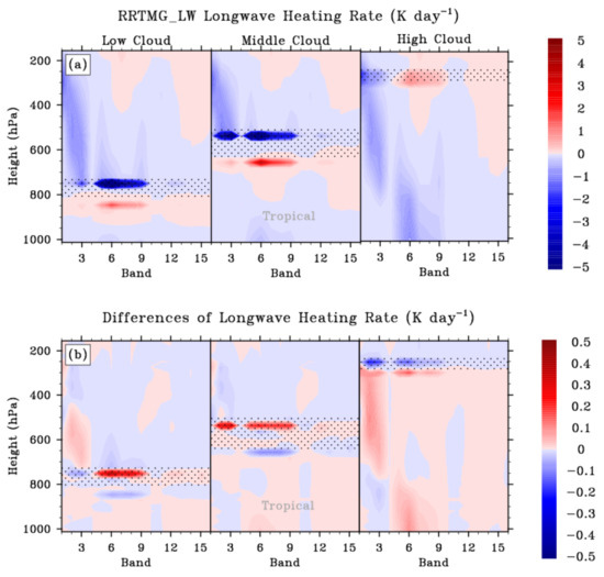 The cloud LW scattering effect on heating rate is exhibited in Figure 3 (dotted area indicates the location of prescribed cloud cases). As the effects in the three atmospheric profiles are very similar, only the results in the tropical profile are shown. The upper row of Figure 3 plots the heating rate simulated with RRTMG_LW and the lower row plots the differences in the heating rate between RRTMG_LW and RRTMG_DISORT_8S (i.e., the LW cloud scattering effect on heating rate). The LW cooling appears above water clouds (left and middle panels in the upper row of Figure 3) and dominates in the first four bands (14.29–1000 µm). The warming at the bottom of water clouds is mainly in bands 6–9 (7.19–12.2 µm). The LW cooling in the atmosphere is due to the energy loss to the outer space (i.e., OLR). While cloud shelters the upward flux from losing and causes a warming effect below.