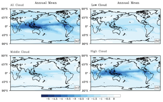 To understand the role of cloud at different vertical levels, we further analyze the LW scattering effect of low, middle, and high clouds respectively. In the diagnostic run, the radiative transfer calculations are applied separately for low clouds (700–1200 hPa), middle clouds (400–700 hPa), and high clouds (50–400 hPa), and the respective differences between RRTMG_LW and RRTMG_DISORT_8S are plotted in Figure 4b–d. The instantaneous LW scattering effects of low and middle clouds are −1.0 W m−2 and −0.8 W m−2, respectively. Its distribution highlights in the western Pacific and storm track regions, where the marine stratocumulus mostly occurs in low and middle levels [52,53]. The LW scattering effect of high cloud is stronger than that of low and middle clouds, with a global mean of −1.4 W m−2. The simulated values here show good agreements with the results estimated from a radiative transfer model by using observed cloud data [8], which are −0.9, −0.7, and −1.4 W m−2 for low, middle, and high clouds respectively. It is worth noting that the distribution of high cloud effect is very similar to that of the all-sky in Figure 4a, which implies that the cloud LW scattering effect is mostly attributed to high clouds. It is consistent with the standalone RRTMG results in Figure 2 and Figure 3 that the cloud LW scattering effect of high ice cloud is more significant than that of low and middle water clouds. It is also understandable when high cloud overlaps low or middle cloud. Because the upward LW fluxes emitting from the top of low or middle cloud are mostly shaded by high cloud in GCM due to the extra absorption or backscattering of LW radiation from high cloud. Intuitively, only a few parts of the radiance from low and middle clouds penetrate through and influences on the upward fluxes at TOA. Although Figure 4 indicates that high clouds composing of ice crystals play a dominant role in the cloud LW scattering effect, the multi-scattering processes between multi-layer clouds could account for the potential effects of low and middle clouds. It may explain why the LW scattering effects of low and middle clouds prevail in the similar regions as the high cloud, where deep convective clouds commonly overlap with low and middle-level stratocumulus [45]. Therefore, high ice clouds play a dominant role in the cloud LW scattering effect, which prevails in the Pacific warm pool, monsoon areas with frequent convective clouds, and storm tracks [45]. But the effects of low and middle clouds may not be simply ignored.