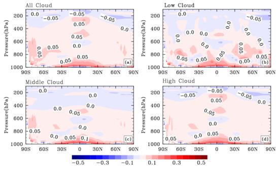 Figure 5a shows the instantaneous cloud LW scattering effect on heating rates under the all-sky condition in the diagnostic run. A warming effect is in most of the troposphere and peaks below 800 hPa in the low latitudes, which is due to more energy kept from escaping to outer space by the cloud LW scattering effect. In Figure 5b–d, changes in heating rate caused by LW scattering effect of low, middle and high clouds are plotted respectively. The LW scattering effect of high clouds on heating rates is very similar to that in the all-sky condition (Figure 5a), especially in tropical regions. It confirms the primary role of high clouds in the LW scattering process in GCM. On the other hand, the LW scattering of low and middle clouds exert a stronger warming effect than that of high clouds in the lower troposphere in tropics but the warming effect damps rapidly with the elevation (Figure 5b,c). It again indicates the potential contribution of low and middle clouds to the LW scattering effect in tropical regions.