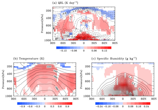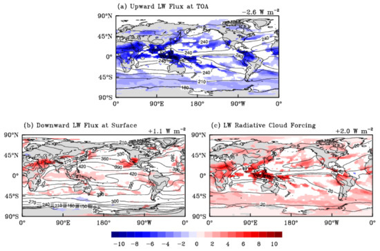The LW scattering effect on LW cloud radiative forcing (LWCF) at TOA is shown in Figure 6c. Clouds exert a positive LW forcing on the climate and the cloud LW scattering effect further enhances LWCF. The peak effect is over the Pacific warm pool and monsoon regions, and the secondary effect is over the African continent and northern Latin America, which is similar to the pattern of Figure 6a. The global mean enhancement of LWCF due to the cloud LW scattering effect is about 2 W m−2 which is roughly comparable to the magnitude of the radiative forcing by doubling carbon dioxide [18,54]. The increase in LWCF exceeds 10 W m−2 in the Pacific warm pool and the local LWCF is 60 W m−2, indicating that the cloud LW scattering effect can lead to a considerable enhancement in the local LWCF. Figure 7 shows the zonal mean distributions of the cloud LW scattering effect on longwave heating rate, temperature, and specific humidity respectively. The longwave cooling is strengthened near the tropopause by more than −0.1 K day−1 but weakened in the troposphere. The reduction in the LW cooling is specifically strong in the lower troposphere at tropics and the local value even exceeds +0.16 K day−1. Comparing to the instantaneous effect on heating rate in Figure 5a, the warming effect caused by the cloud LW scattering is more obvious in extratropical regions in Figure 7a, which is consistent with the extra reduction in upward flux at TOA in the same region from Figure 4a to Figure 6a. As mentioned before, the climate feedbacks on the increased water vapor and cloud amount explain for the enhanced effect of cloud LW scattering from the diagnostic run to the interactive run.