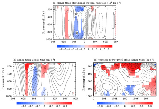As shown in Figure 7b,c, the thermodynamic feedback caused by cloud LW scattering effect increases temperature at almost all latitudes in the northern hemisphere but only at low latitudes in the southern hemisphere. Therefore, the meridional temperature gradient becomes greater in the southern hemisphere compared to the northern hemisphere. Additionally, the meridional temperature gradient becomes larger in the upper troposphere because the temperature change due to the cloud LW scattering effect is more significant in high levels than near the surface (see Figure 7b). The temperature gradient change affects the climate dynamics and global circulations, such as the variation of Hadley circulation is associated with the meridional temperature gradients [56,57]. Keeping this in mind, Figure 8a shows the change of zonal mean meridional stream function (a proxy for the strength of circulation) due to the cloud LW scattering effect. The Hadley circulation in the southern hemisphere is strengthened, which modulates the westerly jet over 30° S and 50° S (see Figure 8b). The increase of the baroclinicity resulted from the changed temperature distributions may have an impact on the jet stream as well [58]. The mean zonal wind (in Figure 8b) near the tropical tropopause is also modified and Figure 8c depicts the details in its meridional distribution. A significant westerly wind anomaly at about 200 hPa is between 120° E and 90° W, corresponding to the position of the upper branch of Walker circulation (in Figure 8c). It could be attributed to the increase of thermodynamic instability resulted from a decrease of temperature over the tropopause (see Figure 7b).