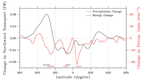 where FA is the meridional northward energy transport in atmosphere (black curves in Figure 9), QS is the net downward shortwave flux at TOA, QL is the upward LW flux at TOA, QO is the net surface fluxes, including sensible heat flux, latent heat flux, net LW flux at the surface, and the net shortwave flux at the surface, λ is the longitude, φ is the latitude and, a is the radius of Earth. Since Hadley circulation dominates atmospheric cross equatorial energy transport, the net energy change between the two hemispheres is another indicator to understand the changes in large-scale circulation caused by the cloud LW scattering. Figure 9 shows the difference in the northward energy transport due to the cloud LW scattering effect. Less northward energy transports over tropics in the southern hemisphere but more energy transports over 40° S–50° S, which can partly explain the strengthening of Hadley circulation (see Figure 8a) and the modulation of the westerly jet in the southern hemisphere (see Figure 8b). Previous studies show that the northward cross-equatorial energy transport always co-occurs with a southward-shifting of ITCZ (Intertropical Convergence Zone) and the moistening in the south of the equator [59,60,61] and vice versa. Therefore, the cloud LW scattering effect on the precipitation (red curves in Figure 9) shows a significant reduction near the equator corresponding to the decreased northward cross-equatorial energy transport. It adds evidence to the changed Hadley circulation and perturbed energy budget in the atmosphere. On the other hand, Figure S5 shows that the reduced rainfall could partly lead to the reduction of latent heat flux, which has a contribution to the change of heat transport in Equation (11). Knowing that the warm and moist air converging near the equator should cause heavy precipitation, and the released latent heat drives strong rising motions [62]. An extra warmer atmosphere resulted from the cloud LW scattering effect in the middle of the troposphere near the equator may inhibit the convergence of moist air, leading to less latent heat release and reduced precipitation.