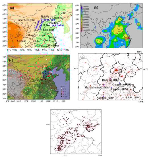 Haze pollution in the southern Hebei province of the North China plain has deteriorated in recent decades [,,]. The highest PM2.5 particles with aerodynamic diameters ≤2.5 μm levels in this region have been reported recently [,,] and can result in severe health risks. Rapid growth in both the economy and energy consumption, especially in coal combustion, industrialization, urbanization, and motorization, together with a unique topography, which is surrounded by mountains to the north and west (Figure 1a) [,,,], have contributed to this heavy pollution. The aerosol pollution in this region has been investigated by several studies using analyses of chemical compositions [,,] and a source apportionment that uses air quality models [,,]. These studies have shown that high level emissions of gaseous precursors (NOx, SO2, and VOCs etc.) and high concentrations of secondary inorganic ions, organic carbon, elemental carbon, and most crustal elements, together with unique local topographic factors and unfavorable meteorological conditions contributed to higher PM2.5 concentration. Overall, coal combustion, industrial and domestic sources, and regional transport were the major contributors to the severe pollution levels in this region []. The main industries and enterprises (power plants and heavy industries etc.) emitting exhaust gases in Hebei Province and the population distribution are shown in Figure 1b,e.