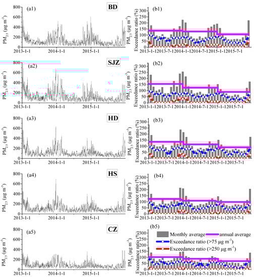 Daily variation (a) and monthly average and exceedance ratio variations (b) of PM2.5 in five cities during 2013–2015. (The Grade II National Ambient Air Quality Standard for the daily limit is 75 μg m−3; BD-Baoding, SJZ-Shijiazhuang, HD-Handan, HS-Hengshui, CZ-Cangzhou).