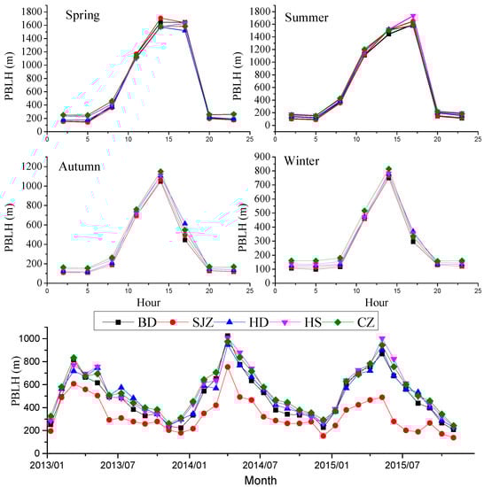 The planetary boundary layer heights (PBLH) in 3-h intervals were obtained from the U.S. National Oceanic and Atmospheric Administration (NOAA) READY archived meteorological GDAS data (1° × 1°) (Available online: http://www.ready.noaa.gov/READYamet.php) based on Coordinated Universal Time (UTC). All UTC values were converted to local time (Beijing time).
