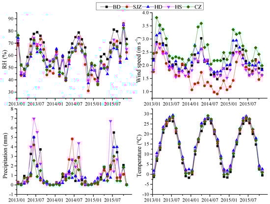 The day-to-day variations of PM2.5 in these cites (Figure 2a) showed similar trends, and the concentrations were elevated synchronously in all cities during heavy haze episodes, largely driven by the evolution of synoptic circulation and meteorological factors. The correlation coefficients between the daily PM2.5 concentrations in the cites were 0.74–0.88 (Table 1), which demonstrated the regional fine particulate pollution characteristic due to the horizontal and vertical homogeneity of the meteorological conditions in the study region (Figure 3 and Figure 4) and the secondary formation of PM2.5 []. The annual average PM2.5 concentrations from 2013 to 2015 in these cities declined significantly each year (Figure 2b). The annual average values in 2013 were in the range of 103–155 μg m−3, but decreased by 30–66 μg m−3 in 2015 and ranged from 70 to 107 μg m−3, with a reduction in the differences among the cities as well. The largest decline was observed in SJZ, from 155 in 2013 to 89 μg m−3 in 2015. The rapid decline of PM2.5 annual means was partially ascribed to the decreased frequency of extremely heavy pollution incidences because of the exceedance ratio at which PM2.5 > 250 μg m−3 (Figure 2) dropped from 3.6–16.2% in 2013 to 1.4–8.2% in 2015. Furthermore, the largest reduction occurred during winter, declining by 24, 119, 88, 51, and 53 μg m−3 in BD, SJZ, HD, HS, and CZ, respectively, between 2013 and 2015. This was the season that contributed the most to the decrease in annual mean PM2.5. The meteorological conditions became slightly unfavorable from 2013 to 2015, with weakening winds, especially in SJZ in 2014, and decreasing humidity, with the exception of autumn (Figure 4). The precursors of PM2.5 (like NO2 and SO2) in North China also significantly declined from 2013 to 2015, which was observed from OMI satellite (Figure S2). Thus, the effectiveness of source reduction measures in this region was significant and facilitated the decline of PM2.5 concentrations. Remarkably, the even stricter environmental protection laws were enforced in China beginning on 1 January 2015 (http://www.gov.cn/xinwen/2014-04/25/content_2666328.htm), which could further the implementation of pollution control measures.