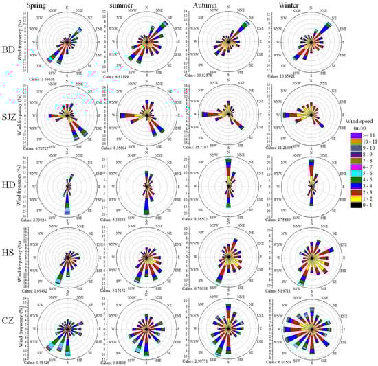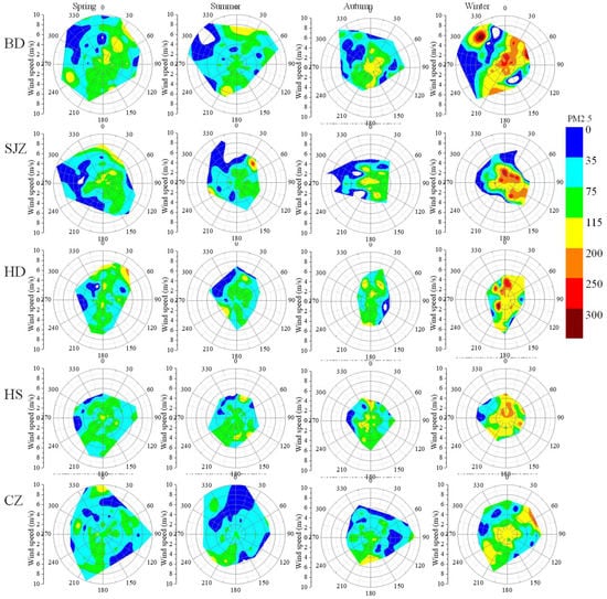 The PM2.5 concentrations of target cities are not only decided by local emissions, but also by the surrounding pollution regions. Maps of wind rose and the relationships between the 6-h average PM2.5 concentration, wind speed, and wind direction in the study cities are presented in Figure 5 and Figure 9 to investigate the regional influence. The lowest wind speeds were found in SJZ, HD, and HS, epically during winter and autumn. The wind speeds associated with southeasterly to southwesterly winds were usually very low, except for HD, HS, and CZ in spring and summer. The strong northwesterly winds were mostly in BD and only occurred during summer in SJZ and CZ. At the remaining sites, northwesterly winds were weak. High PM2.5 values were associated with weak winds, less than 2 m s−1, which revealed higher local emissions. Low PM2.5 values were associated with winds from the northwest except during winter. In most cities, PM2.5 concentration increased with elevated wind speed in different wind directions, which is indicative of the influence of the regional transport from the surrounding polluted regions. The regional transport is discussed in detail in the next sections.