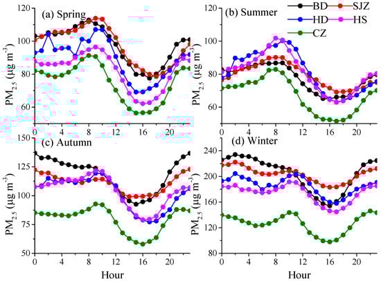 The seasonal diurnal variation of PM2.5 in all the study cities during 2013–2015 is shown in Figure 6 to identify the potential emission sources. A bimodal pattern with peaks during the morning rush hours (e.g., traffic exhausts) and at night was observed. The morning peak during autumn and winter was approximately 1–2 h later compared to that in spring and summer (8–9 a.m.), due to the low PBLH before noon (Figure 3). The decreased afternoon concentrations were attributed to the better dispersion conditions, with increasing PBLH and wind speeds. From 1600 to the nighttime, the afternoon rush hours and increased source activities caused an increase PM2.5 concentration, while the declining PBLH after sunset resulted in pollution accumulation. The highest PM2.5 concentrations in all cities occurred during winter and autumn. Furthermore, the concentrations at night were higher than during the day. This was associated with the enhanced emissions from domestic heating and the lower PBLH. The best air quality occurred during the summer due to good diffusion conditions and less anthropogenic emissions, with minimum concentrations during the afternoon between 52 and 69 μg m−3, which also exceeded the CAAQS Grade II The highest concentrations were observed in SJZ and BD, except during summer, and the lowest were observed in CZ. This can be explained by the higher emissions from industrial and residential sources [,] and more stagnant atmosphere with lower PBLH in SJZ and BD. However, during summertime, the highest concentrations occurred in HD and HS. One possible explanation are the weak winds and the higher frequency of southerly winds (Figure 2a).