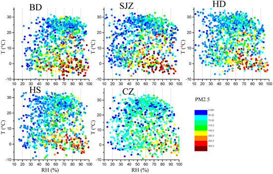 PM2.5 concentrations were significantly positively correlated with RH during all seasons and in all cities, with stronger correlations during winter. Weak correlations in summer and autumn were ascribed to massive precipitations in summer and early autumn, which contributed to higher humidity and eliminated particles through wet deposit. The RH- and T-dependent distribution of PM2.5 and wind speed (Figure 7 and Figure 8) demonstrated an obvious concentration gradient with the elevated RH. On average, the lowest PM2.5 concentrations occurred at RH < 30% with no dependence on T, which was likely due to the ability of the high winds to disperse the pollutants. The PM2.5 showed a rapid increase when RH > 50%, especially at low temperatures. These results illustrated that severe haze events in this region mostly occurred in conditions of high humidity, weak winds, and high emissions due to heating in cold periods. High humidity plays an important role in elevating pollution levels by facilitating particle transformation, hygroscopic growth [,] and the partition of semi-volatile species into the aerosol phase [], meanwhile high humidity usually accompanies lower PBLH [].