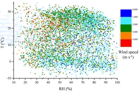 The relationship among T, RH, and wind speed for all data in 5 cities during 2013–2015.
