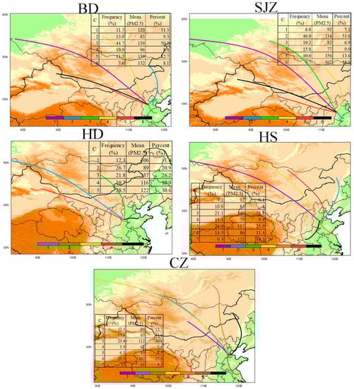 The HYSPLIT4.9 model from the (NOAA) Air Resources Laboratory (Available online: http://ready.arl.noaa.gov/HYSPLIT.php) and meteorological data (GDAS for 1° × 1° resolution) were used to calculate the individual, three-day backward trajectories. The trajectory endpoint was the city center at a height of 200 m above ground level (i.e., within the mixed layer). The city centers were located in BD at 38.89° N and 115.49° E, SJZ at 38.05° N, and 114.54° E, HD at 36.60° N and 114.52° E, HS at 37.74° N and 115.68°E, and CZ at 38.32° N and 116.87° E). The backward trajectories were calculated at 00:00, 03:00, 06:00, 09:00, 12:00, 15:00, 18:00, and 21:00 UTC every day for each city during 2013–2015 in five cities. Three-hour averaged PM2.5 concentrations before the end time of each trajectory were combined with the backward trajectories and used for the trajectory cluster and receptor models.