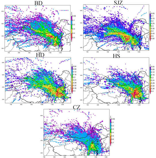 The potential source contributions to the high PM2.5 concentrations varied among the cities (Figure 11). These results suggested that regional transport from the northwest and south of BD and SJZ played a dominant role in the formation of severe haze pollution events. These regions included southwestern Inner Mongolia, northern Shanxi and Shannxi, southern Hebei, eastern Henan, western Shandong, and northern Anhui and Jiangsu. The high potential source regions for HS were located in southern Hebei, Shandong, Henan, and northern Jiangsu and Anhui. Remarkably, the domain of potential sources was the largest in HD and smallest in CZ. The high PSCF values for HD were located in western Inner Mongolia, northern Shannxi, southern Shanxi and Hebei, Tianjin, eastern and central of Henan, western and southern Shandong, and northern Jiangsu and Anhui. The high PSCF values for CZ were in southern Hebei, Shandong, eastern and central of Henan, northern Anhui and Jiangsu, and central Hubei.