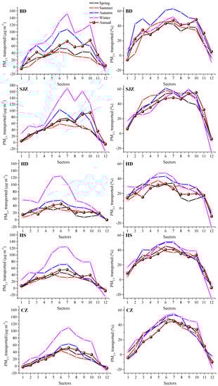 According to the TSA method, annual and seasonal 12 sector concentrations (Cj) and percentages (%Cj) of PM2.5 in the study cities are presented in Figure S4, which demonstrated evident sector gradients. On average, with the exception of HD, the highest mean concentrations of PM2.5 (ranging from 138–170 μg m−3 in BD and SJZ, and 97–135 μg m−3 in HS and CZ) were associated with sectors 6–10, moderate mean concentrations with sectors 2–5 and 11, and the smallest mean concentrations (ranging from 58–87 μg m−3) in sectors 1 and 12. The highest concentrations of PM2.5 were in sectors 4–6 in HD, ranging from 124–136 μg m−3, and the lowest concentrations in sector 12 (91 μg m−3). The concentration gradients of the trajectory sectors in BD and SJZ were larger than those in HD, HS, and CZ, which indicated there were more contributions from regional transport to PM2.5 pollution levels in BD and SJZ. The seasonal variation in sector concentrations exhibited similar trends to the annual variation in all cities. However, the concentrations in all sectors were highest in winter, while sectors 5–7 had the highest summer concentrations. The sector concentration percentages were highest in sectors 6–7 and 10–11 for BD and SJZ, sectors 1–3, 5–7, and 10–12 for HD, and sectors 6–7 for HS and CZ. In addition, the increased sector percentages came from the southerly sectors during the summer and the westerly sectors during the winter due to the transition in the predominant wind direction.