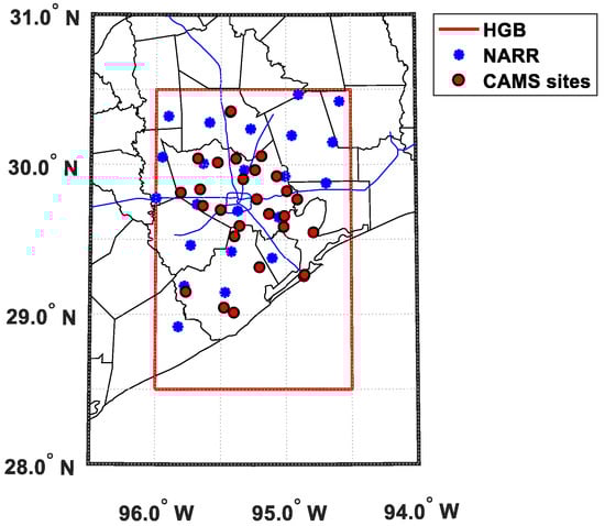 The meteorological data (u and v wind components, temperature, precipitation, relative humidity (RH), and cloud cover) over the HGB area were extracted from The National Center for Environmental Prediction (NCEP) and NARR products [23]. The products have a spatial resolution of 32 km × 32 km horizontally with 45 vertical layers, and temporal resolution of every 3 h from 1979 to present, based on observations used in NCEP/NCAR Reanalysis Project. Only grid points (blue “*” in Figure 1) over land in the HGB area were used to calculated daily average meteorological factors.