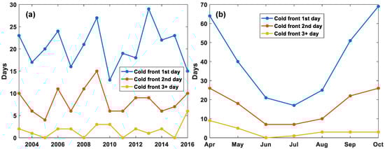 Figure 2 shows the time series of cold front days from 2003–2016. There were 427 cold front days during the April–October time frame. Cold front 1st, 2nd and 3+ days totaled 287, 116 and 24 days, respectively. Since only 5.62% of cold front days were cold front 3+ days, we merged cold front 2nd and 3+ day as cold front 2+ days (140 days in total) in the following analysis. The annual time series of cold front counts show no clear trend during the 14-year study period. There were 30.5 cold front days per year during April - October on average. Highest number of cold front days (45 days) happened in 2009 while lowest number of cold front days (22 days) happened in 2010. Monthly time series show that cold front days in summer (JJA) were significantly less than during colder months. In the USA, like most countries located in Northern Hemisphere, northerly wind which brings cold airmass is more frequent during cold months. Cold front is a kind of events featured by northerly wind. It makes sense that cold front in summer is less than cold months.