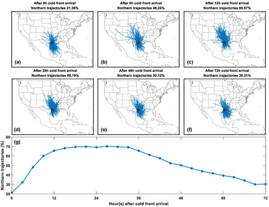 Twenty-four-hour back trajectories start at (a) 0; (b) 6; (c) 12; (d) 24; (e) 48; and (f) 72-h after the cold front line reached the HGB area; (g) Time series of northern trajectories percentages every 3-h.