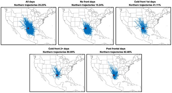 Figure 3a–f shows 24 h back trajectories started at 0, 6, 12, 24, 48, and 72-h after the cold front lines reached the HGB area. For example, a cold front reached the HGB at 15:00 24 April 2004. The back trajectory start hour for this cold front of 0, 6, 12, 24, 48, and 72 h frame are 15:00, 21:00 24 April, 03:00, 15:00 25 April, 15:00 26 April, and 15:00 27 April 2004, respectively. We run every trajectory for 24 h. For example, the trajectory starts at 48 h cover the time 48–72 h after cold front passage and trajectory starts at 72 h cover the time 72–96 h after cold front passage. To study the cold fronts overall behavior, each frame plots all cold fronts in the study period. Since cold fronts would alter wind direction over the HGB from south to north, we can quantify cold front influence by percentage of northern trajectories. We got 8 points other than the start point for each trajectory since 24-h back trajectories run with 3-h resolution. Average latitudes for each trajectory are the mean latitudes of 8 points. A northern trajectory was defined as a trajectory with average latitude greater than its start point (29.72 N in this study).