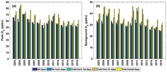 Cold fronts showed increasing effects on both peak and background O over the HGB area. Compared to no front days, average peak O mixing ratios during the cold front 1st days, cold front 2+ days, and post frontal days increased 0.7, 5.9, and 9.0 ppbv, respectively while average background O increased 2.9, 6.8, and 8.6 ppbv, respectively. The annual decreasing trend of O during cold front related days was larger than no front days. Since O during cold front related days is more heavily affected by anthropogenic sources compared to no front days usually with clean southernly flow, it suggests that cutting down anthropogenic emission of O precursors may have played a more important role in reducing the O exceedances than increasing southerly flow [33]. Over the HGB area, average O was lower during southern flow days especially in summer [28]. It might be the reason why cold fronts caused larger background O differences between cold front related days and no front days in summer (JJA) than in cooler months.