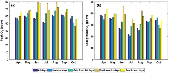For temperature, usually it shows positive correlation with O [39]. Depressed temperatures decreased the upper limit of peak O but did not reduce the mean and median values of peak O (Figure 9d). On the other hand, depressed temperatures unusually increased the mean and median values of background O (Figure 10d). Note that cold fronts decreased temperature and brought high background O through changes in wind direction at the same time. This implies that temperature effects might be overshadowed by changes in wind direction. It also helps to explain why depressed temperatures showed increasing effects on O levels (Table 2).