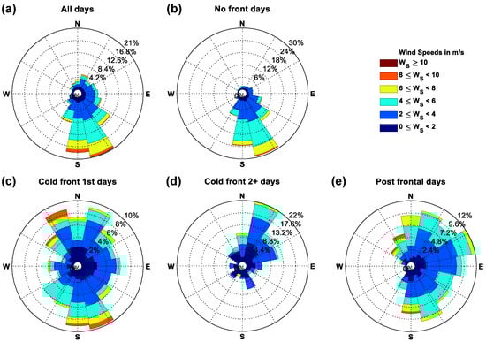 Wind rose during (a) all days; (b) no front days; (c) cold front 1st days; (d) cold front 2+ days; and (e) post frontal days.